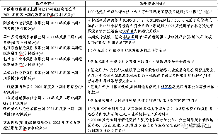 自2021年3月16日,重慶醫(yī)藥(集團)股份有限公司2021年度第四期超短期融資券(鄉(xiāng)村振興)作為第一只鄉(xiāng)村振興票據(jù)面世以來,鄉(xiāng)村振興票據(jù)受到的關(guān)注越來越多。2021年3月19日,銀行間市場交易商協(xié)會通過官方微信公眾號發(fā)布了《債務(wù)融資工具注冊發(fā)行業(yè)務(wù)問答(第8期)》(以下簡稱“《問答》”),對鄉(xiāng)村振興票據(jù)的實施細(xì)則進(jìn)行了明確,確認(rèn)募集資金投向分別對應(yīng)的是農(nóng)民就業(yè)增收項目、農(nóng)業(yè)現(xiàn)代化建設(shè)項目和農(nóng)村鄉(xiāng)村建設(shè)三大領(lǐng)域。