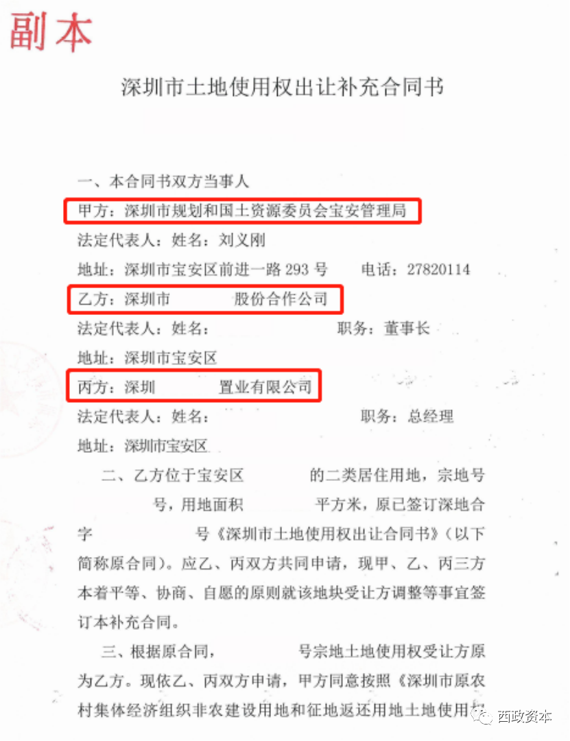 土地整備利益統(tǒng)籌項目的村股份公司留用地合作開發(fā)在雙抬頭的模式下,亦涉及將原屬于村股份公司的留用地變更至村股份公司和開發(fā)商雙方名下的操作,也即由雙方共同持有土地使用權(quán)。目前實務操作一般是規(guī)劃和自然資源部門先跟村股份公司簽訂《土地出讓合同》(村股份公司為受讓人),然后由規(guī)劃和自然資源部門、村股份公司及開發(fā)商三方再簽訂《土地出讓合同補充協(xié)議》,將土地使用權(quán)的受讓人變更為村股份公司和開發(fā)商兩方,由雙方共同持有留用地土地使用權(quán),也即土地證辦理完成后權(quán)屬人是雙主體。具體項目報批報建時,由開發(fā)商和村股份公司一起作為雙主體進行申報,所有對政府的手續(xù)和文件都需要雙方蓋章,包括預售合同也都是雙方蓋章,當然,為避免操作上的繁瑣問題,常見的做法是在預售前村股份公司出具經(jīng)公證的委托書,全權(quán)委托開發(fā)商辦理所有后續(xù)手續(xù)和預售、物業(yè)管理聘請等事宜。物業(yè)分配時,村股份公司和開發(fā)商再按照土地出讓合同和補充協(xié)議約定的分配比例分配物業(yè),下圖為利益統(tǒng)籌項目留用地《土地出讓合同補充協(xié)議》的示例。