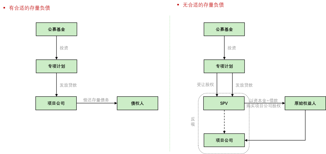 在有合適存量負債的情況項下,專項計劃受讓項目公司100%股權(quán),然后直接向項目公司發(fā)放股東貸款,項目公司用于償還存量債務(wù)解決現(xiàn)金沉淀問題;