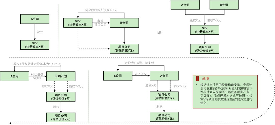 在沒有合適存量負債的情況項下,專項計劃受讓SPV100%股權(quán),然后向SPV發(fā)放股東貸款,SPV以其獲得的股權(quán)投資與債權(quán)投資,共同出資受讓項目公司100%股權(quán),然后進行反向吸收合并。