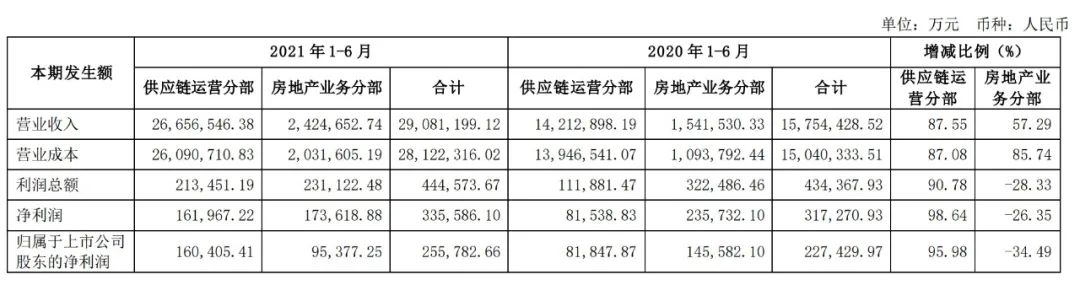 2021上半年,建發(fā)股份房地產(chǎn)業(yè)務(wù)的利潤總額為32.2億元,同比下降了28.3%;凈利潤、歸母凈利潤也都分別下降了26.4%、34.5%,為31.7億元、22.7億元。