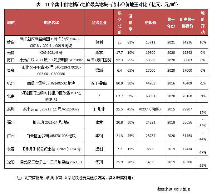 從11個已經(jīng)完成首批集中土拍城市的地價水平來看,和2020年全年涉宅地價格相比,11城中福州、廣州、長春、杭州和深圳成交地價不及去年水平,其余城市地價上漲均十分突出,尤其是重慶,增幅最大,高達(dá)50%,廈門在島內(nèi)兩宗優(yōu)質(zhì)地塊的助力之下,地價也明顯上升,5宗地平均樓板價達(dá)35823元/平方米,超越了一線的北京和深圳。