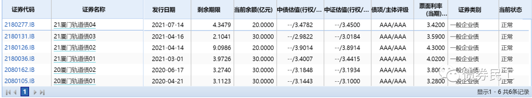 廈門軌道集團的主體信用等級為AAA(上海新世紀),目前存量債券有6只,存量債券金額為160億元,均為企業債券。