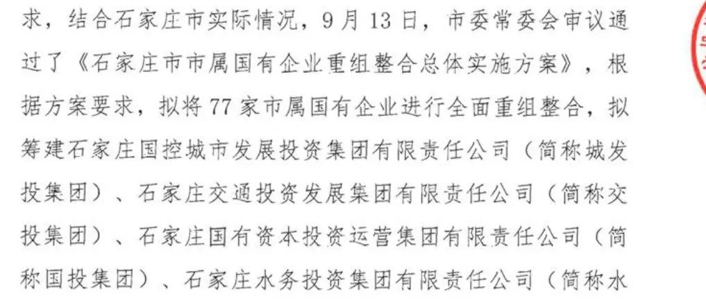 (1)2021年9月22日,石家莊國控投資集團有限責任公司披露了更名及資產劃轉的公告,石家莊市擬將77家市屬國企進行全面重組整合,籌建石家莊國控集團、石家莊旅投集團、石家莊國投集團、石家莊交通投集團、石家莊水投集團五大集團。其中石家莊國控涉及的劃出部分與主責主業非緊密聯系型企業或資產,將突出集團主業的企業和資產劃入。本次資產劃轉涉及的資產規模變動超過500億元,可謂是城投公司整合的大手筆。