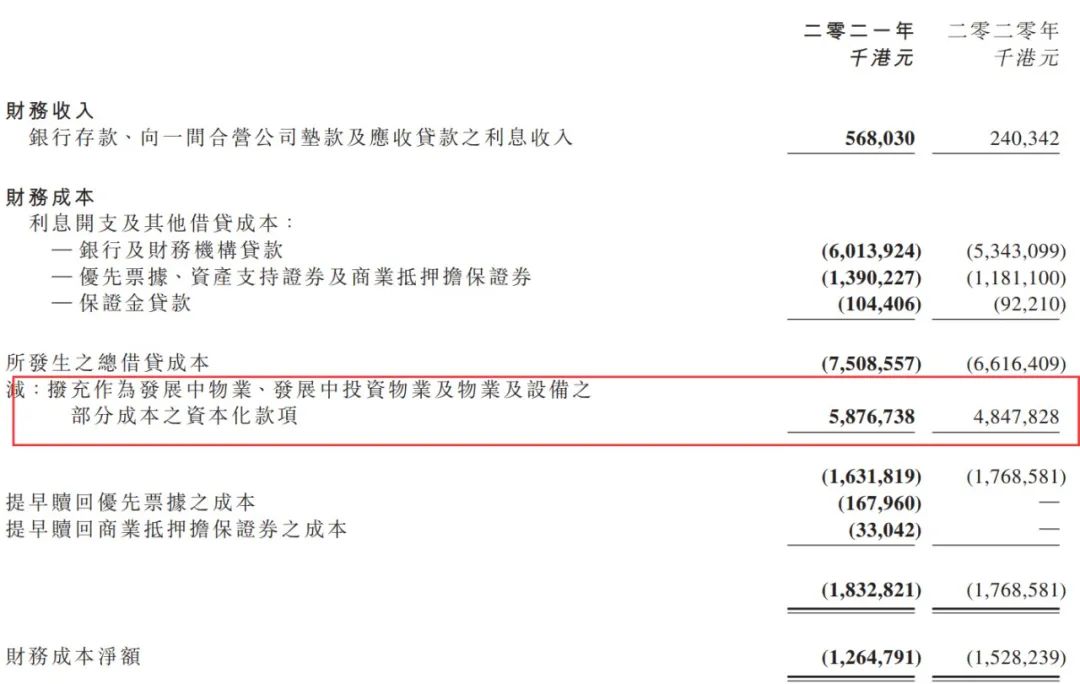 基于此,2021年合生創展的財務成本其實是增加的,如下圖期內其總借貸成本為75.09億港元,同比增幅13.5%。但因為搞了部分成本資本化,所以其財務成本凈額同比下降。2021年合生創展的部分成本資本化額度為58.77億港元,比2020年的48.48億港元多了21.2%。