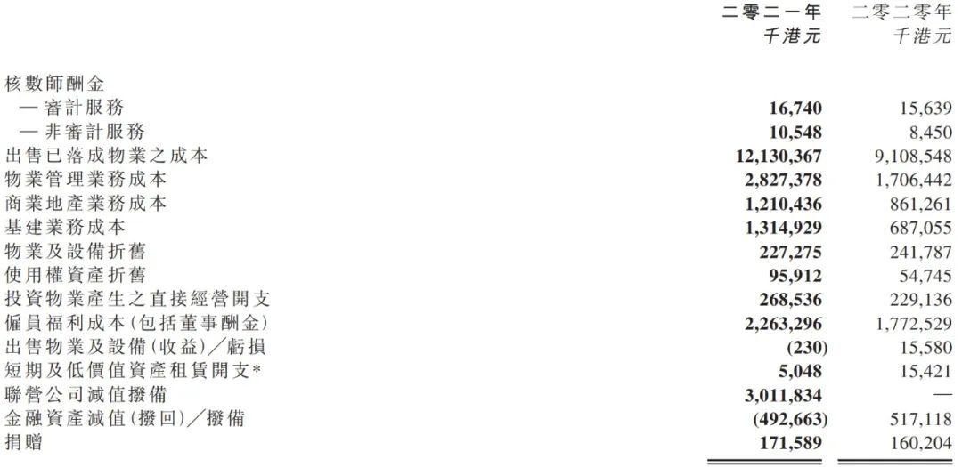 仔細看杠桿地產發現確實有幾項支出增加明顯,比如物業管理業務成本,同比增加約66%;基建業務成本,同比增加約91.4%;雇員福利成本(包括董事酬金)同比增加27.7%為22.6億港元;聯營公司減值撥備30.12億港元。
