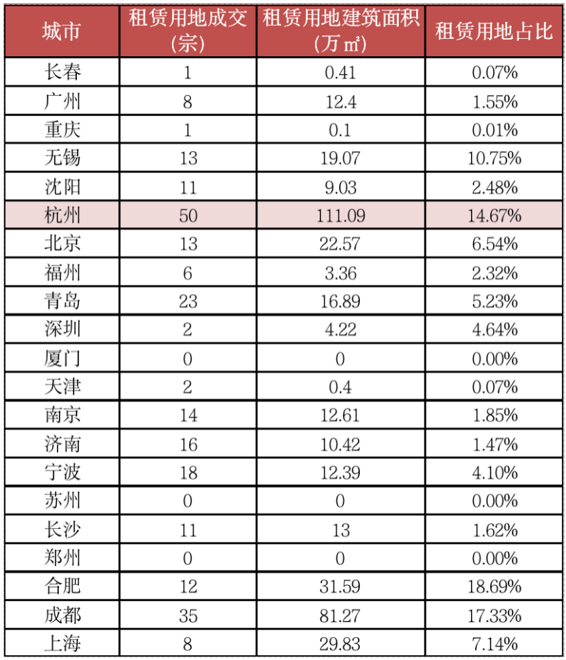 從首批租賃用地成交情況來看,杭州競(jìng)自持用地高達(dá)41宗,占比超七成,其中已成交涉租賃用地成交宗數(shù)達(dá)50宗,占成交地塊88%;成交建面111.09萬平方米,高居22城榜首,租賃用地占比已達(dá)14.67%。成都已成交涉租賃用地也達(dá)到了35宗,租賃用地面積達(dá)到81.27萬平方米,占比達(dá)17.33%;合肥這一比例更高,租賃用地面積占已成交地塊面積達(dá)到18.69%。此外,廈門成交土地共5宗,所有地塊均需部分自持。