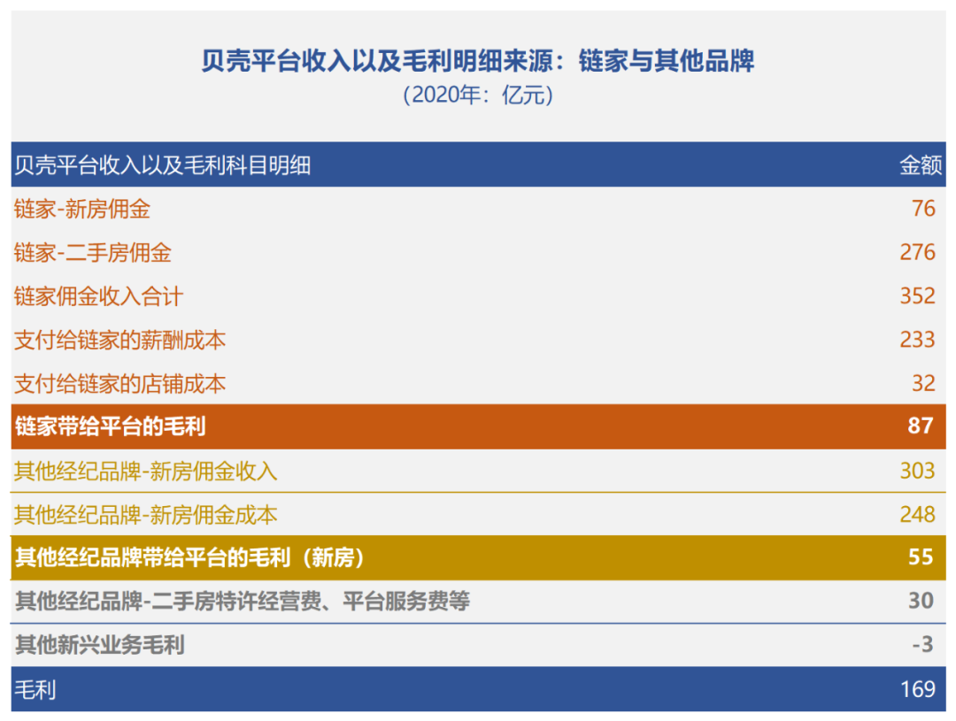 其他經(jīng)紀(jì)品牌貢獻(xiàn)了11063億元的GTV,拿走了248億元的傭金分成,貝殼留下了55億元的毛利。