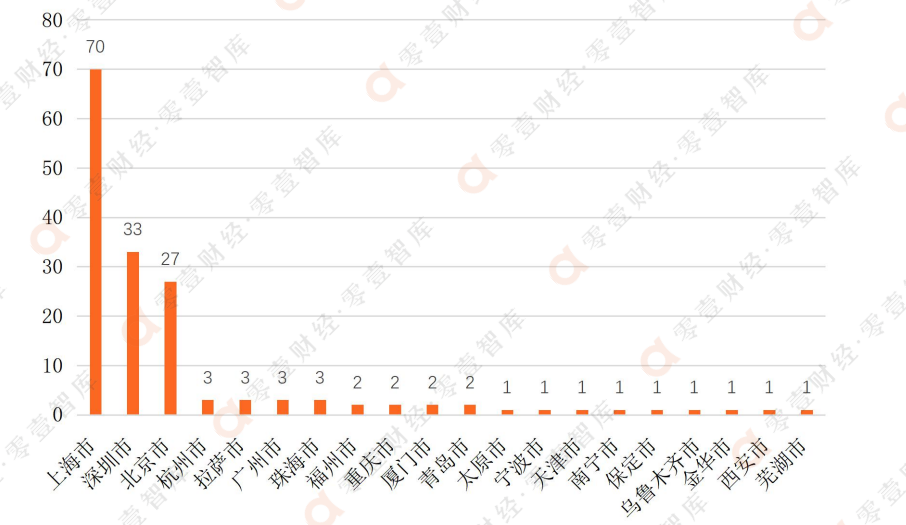 按注冊地區分,目前公募基金管理人絕大多數集中在上海、深圳、北京三地注冊,而杭州、拉薩、廣州等地的注冊家數均在5家以下。