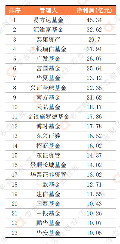 盈利方面,在已公布了2021年凈利潤數據的83家公募基金管理人當中,超過一半的凈利潤在0~5億元之間,而有23家的凈利潤超過10億元,其中9家的凈利潤超過20億元。在這當中,易方達基金的2021年凈利潤達到45.34億元,排名第一,其次是匯添富基金的32.62億元,以及泰康資產的29.70億元。