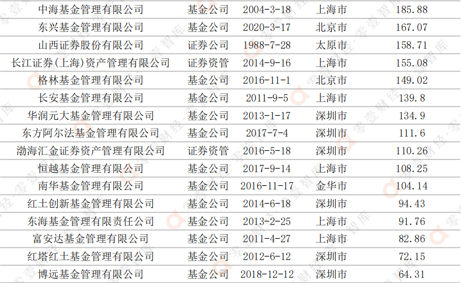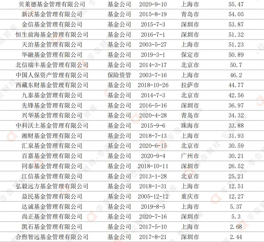 與此同時,有10家管理人的管理規模在10億元以下,其中有8家的管理規模高于1億元,而明亞基金和易米基金的管理規模則是低于5000萬元的“清盤線”(多數公募基金的合同生效后,如在規定時間內基金份額持有人數量不滿200人或資產凈值低于5000萬元,將觸發清盤)。