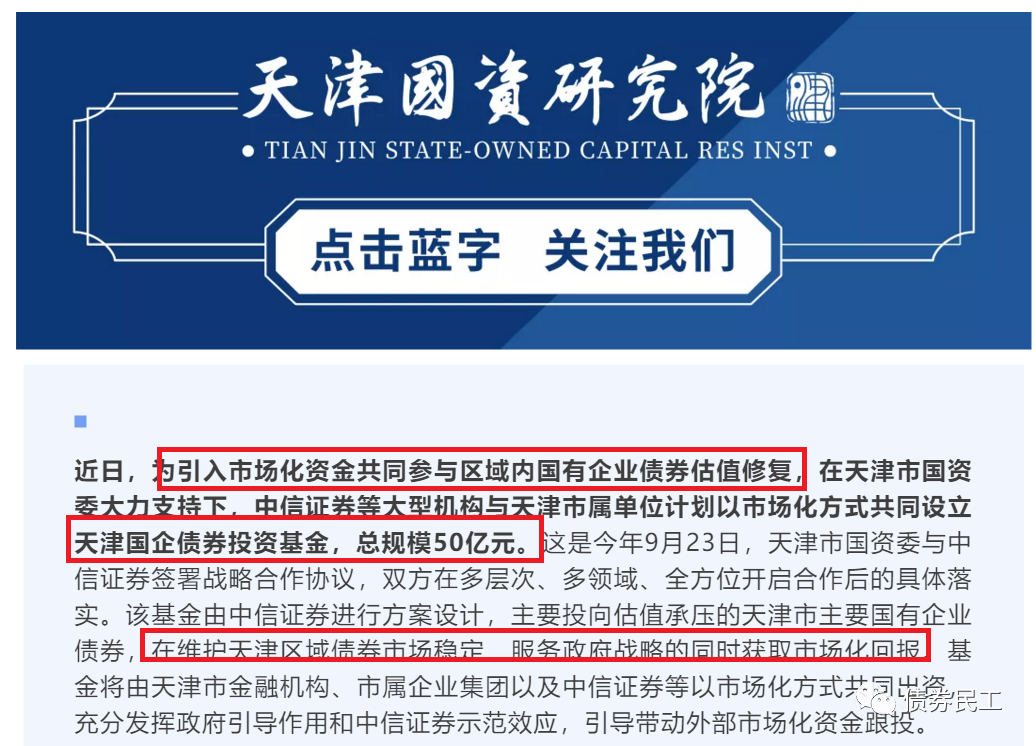 根據天津市國資委的微信公眾號,天津市設立了50億元的國企債券投資基金,用于維護天津區域債券市場穩定,修復國有企業債券估值。