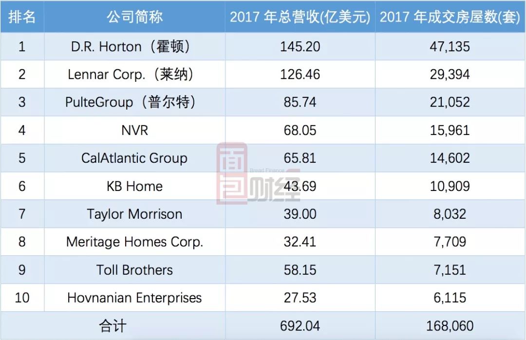 根據美國Builder雜志每年對全美房地產開發商的排行,我們可以看到美國開發商的營收和房屋成交情況,下表為2018年的TOP10: