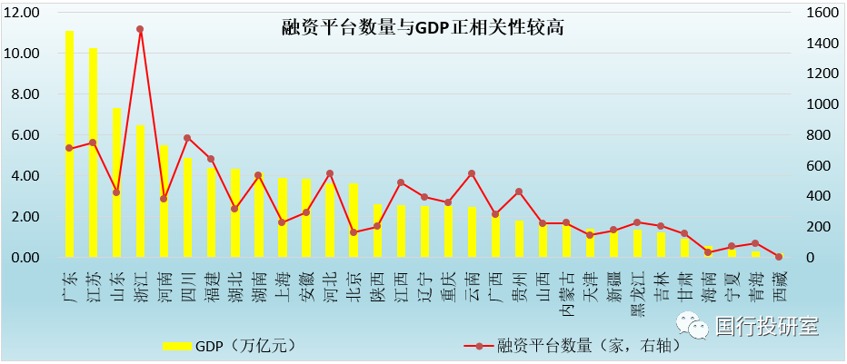 2、數據上顯示,融資平臺數量分布與地區GDP之間有較高的相關性,如融資平臺主要分布在浙江、四川、江蘇、廣東、福建、河北、云南、湖南、江西、貴州、山東、遼寧等12個地區的融資平臺數量占比達到70%左右。這主要是因為穩增長的背景下,承擔著各地基建主要任務的融資平臺具有存在的必要性,特別是地方政府債券額度較為有限的低經濟總量地區。