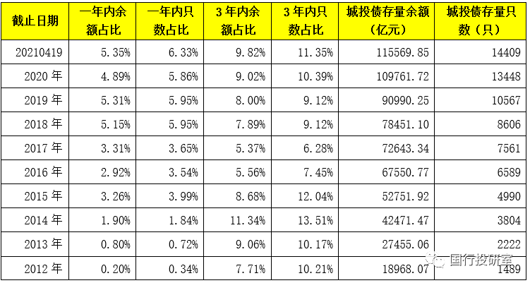 2、截至2021年4月19日,1年內和3年內城投債存量余額占比分別為5.35%和9.82%,且從整體趨勢上看,城投債的期限有縮短傾向。