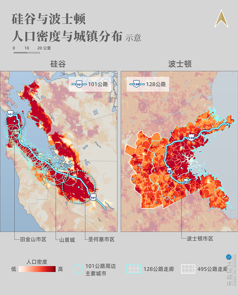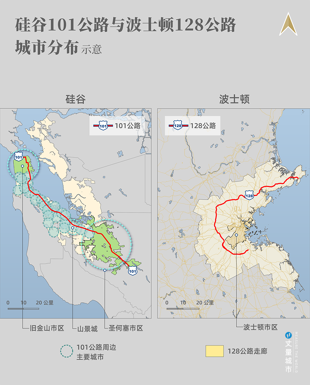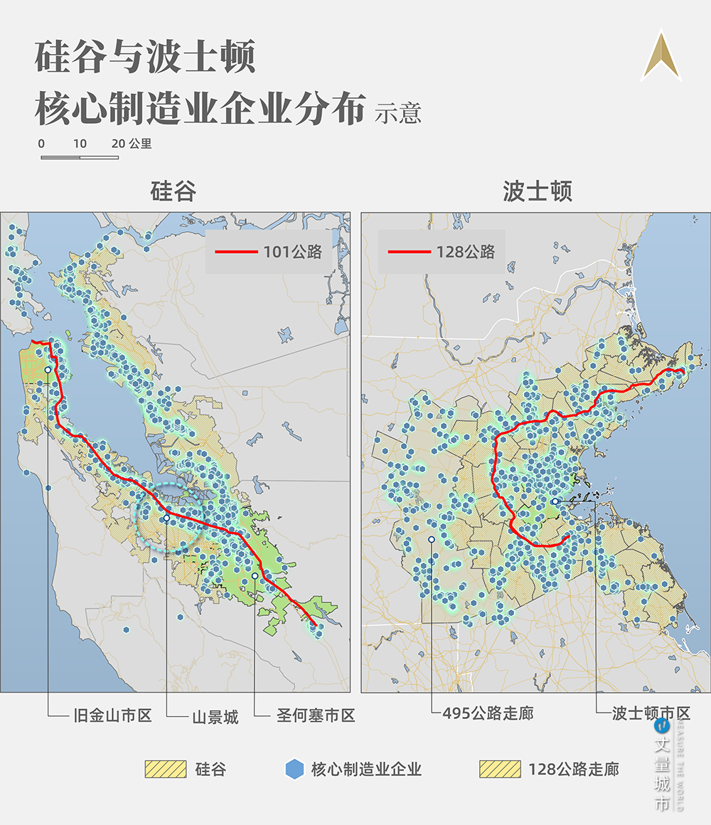 二是,兩者的發展歷程非常相似——二戰之后,101公路舊金山至圣何塞一段,發展成為硅谷;與此同時,波士頓的128公路沿線,成為科技企業聚集區。