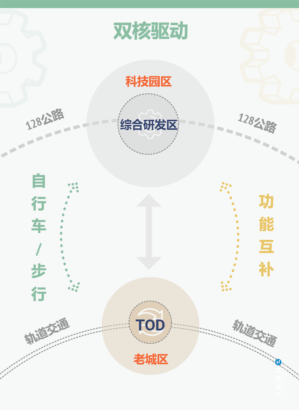 128公路的解決思路是——小鎮們雙核驅動發展,即:以產業園區為核心的綜合研發區,以TOD(即以公共交通為導向的城市發展模式)為中心的老城文化生活區。