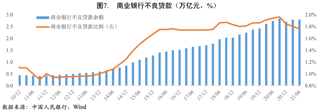 截至2021年6月末,我國商業(yè)銀行不良貸款余額2.79萬億元,較上年末增加892.78億元;商業(yè)銀行不良貸款率1.76%,較上年末下降0.08個百分點,主要是國內(nèi)經(jīng)濟延續(xù)良好復(fù)蘇態(tài)勢,疊加監(jiān)管部門引導(dǎo)金融機構(gòu)強化風(fēng)險防范、加大不良處置力度,使得商業(yè)銀行信貸資產(chǎn)質(zhì)量保持穩(wěn)定。此外,去年為對沖疫情影響出臺的普惠小微企業(yè)貸款延期還本付息政策和信用貸款支持政策,進一步延長至2021年底,有利于穩(wěn)定企業(yè)現(xiàn)金流,緩釋流動性風(fēng)險,對商業(yè)銀行不良貸款率的穩(wěn)定具有積極效果。