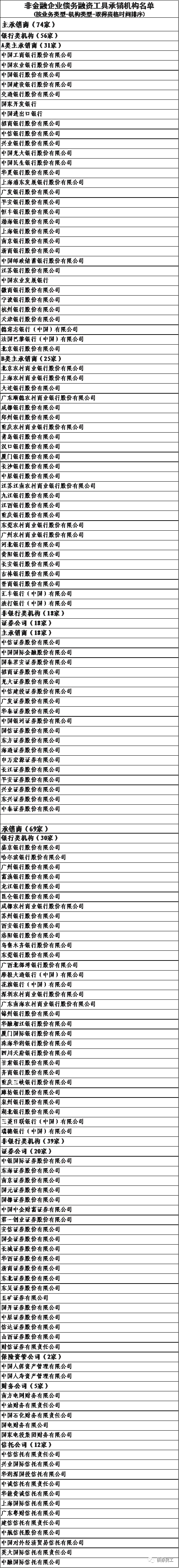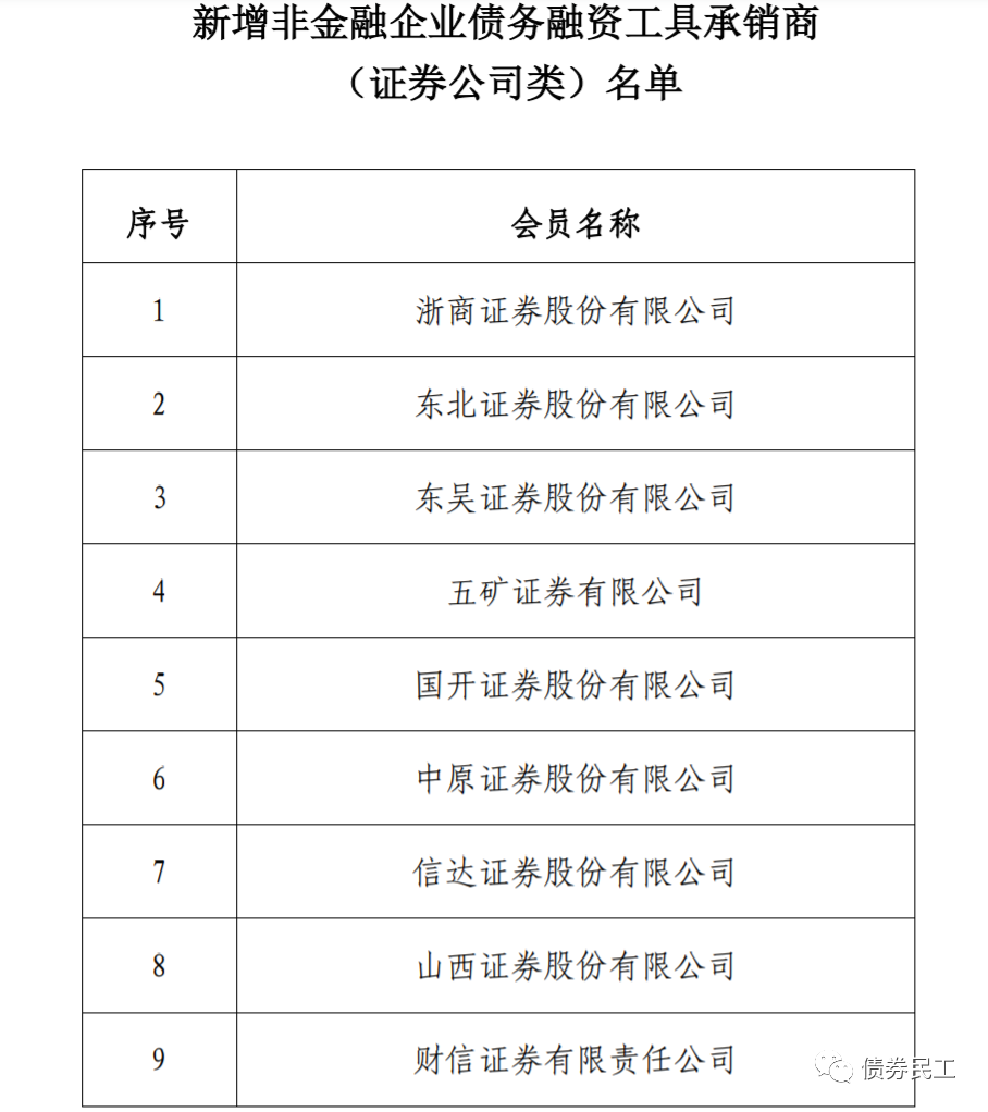 根據(jù)銀行間交易商協(xié)會2021年9月26日印發(fā)的《關(guān)于意向承銷類會員(證券公司類)參與非金融企業(yè)債務(wù)融資工具承銷業(yè)務(wù)市場評價結(jié)果的公告》,浙商證券、東北證券、東吳證券、五礦證券、國開證券等9家證券公司可開展非金融企業(yè)債務(wù)融資工具承銷業(yè)務(wù)。需要注意的是,這9家證券公司獲得的是承銷商資質(zhì),不是主承銷商資質(zhì)。