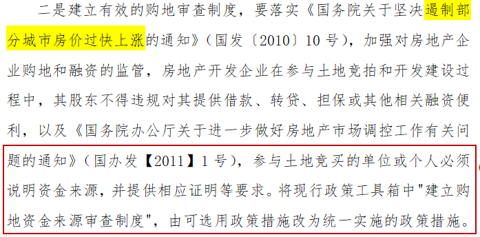 競買人的資金必須為自有資金。建立有效的購地資金審查制度,加強對房地產(chǎn)企業(yè)購地和融資監(jiān)管,房地產(chǎn)企業(yè)在參與土地競拍和開發(fā)建設(shè)過程中,其股東不得違規(guī)對其提供借款、轉(zhuǎn)貸、擔(dān)保或其他相關(guān)融資便利。參與土地競買的單位或個人必須說明資金來源,并提供相應(yīng)證明等要求。將現(xiàn)行政策中“建立購地資金來源審查制度”,由可選用政策措施改為統(tǒng)一實施的政策措施。