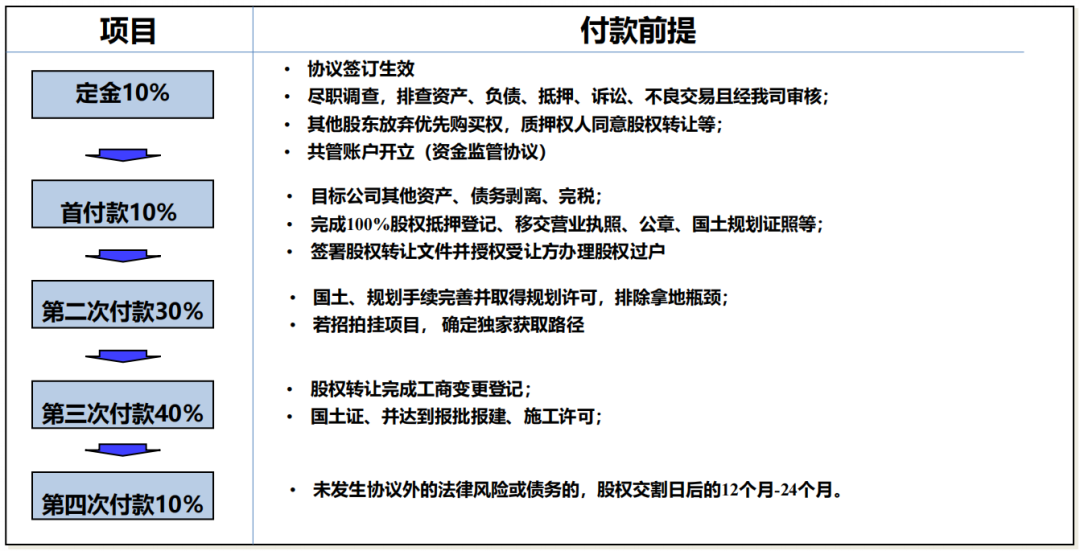 在收并購項目中,一般會將對價分多批次支付,通過共管+解付條件控制每一筆資金支出。所謂不見兔子不撒鷹,每一筆款項支付必須結(jié)合關(guān)鍵節(jié)點+得到對等的權(quán)益。如涉及到需要我方先付的情況,則必須要求對方足額擔(dān)保。