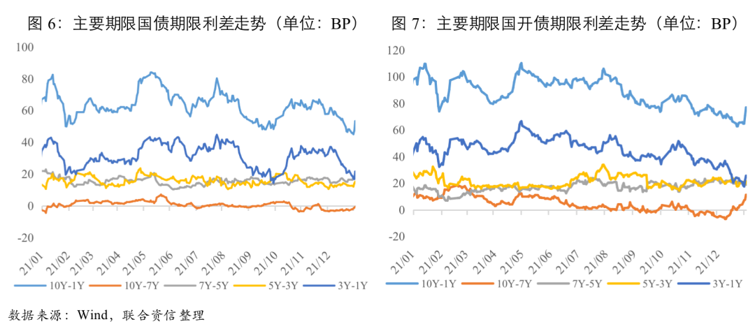 利率債收益率曲線趨于平坦化。2021年利率債短端收益率下行幅度不及長端收益率下行幅度,10Y-1Y期限利差震蕩下行,利率債收益率曲線趨平。特別是下半年以來,受實體經(jīng)濟融資需求不足、經(jīng)濟下行壓力加大及短端資金利率下行幅度有限等因素影響,利率債收益率曲線平坦化趨勢較為明顯。從各主要期限利差走勢特點看,利率債收益率曲線走平主要是由于3Y-1Y期限利差收窄所致,這在一定程度上反映出市場對短期經(jīng)濟下行壓力的擔(dān)憂有所加深。此外,2021年下半年以來,10年期和7年期國債收益率、國開債收益率均出現(xiàn)“倒掛”,反映出市場對經(jīng)濟在中長期表現(xiàn)的擔(dān)憂。