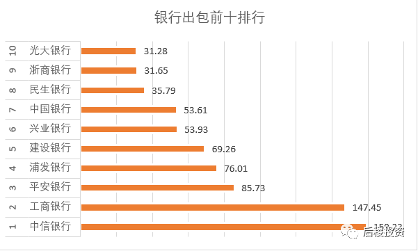 從數據來看,排名前十的銀行出包734億,占了銀行端整體出包金額的82%,集中度較高。其中中信銀行出包規模第一,超過159億。排行來看,四大行之一的農行沒上榜,實際農行的出包金額是28億。