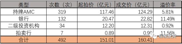 淘寶債權拍賣全年成交492次,成交金額超過160億。其中持牌AMC與銀行出包占了全部成交金額的90%以上,銀行出包溢價率最高。