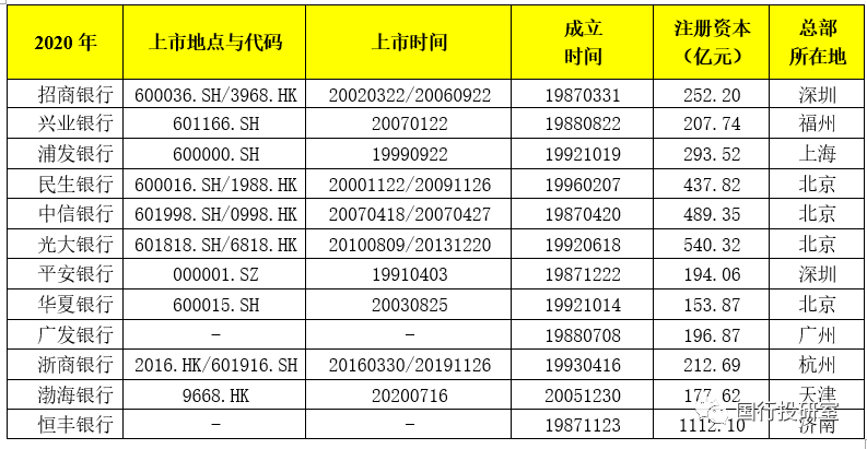 從成立時間上來看,招行、中信銀行、恒豐銀行、平安銀行、廣發銀行與興業銀行等6家股份行均成立于1987-1988年,光大銀行、華夏銀行、浦發銀行與浙商銀行等4家股份行均成立于1992-1993年,民生銀行成立于1996年、渤海銀行成立于2005年。