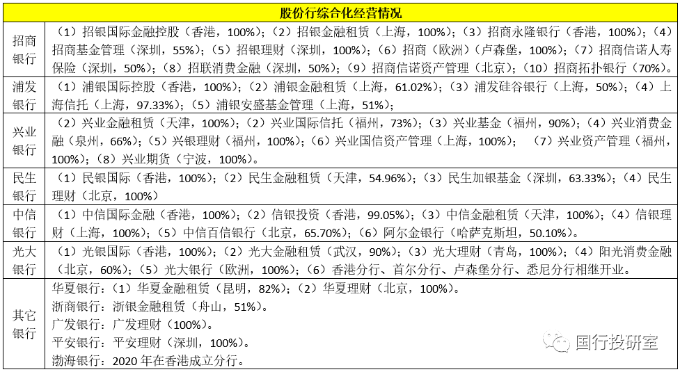 2、多數銀行擁有金融租賃牌照,招行、興業銀行、光大銀行擁有消費金融牌照,招行、浦發銀行、興業銀行與民生銀行擁有基金牌照,浦發銀行、興業銀行擁有信托牌照,招行與中信銀行擁有直銷銀行牌照。