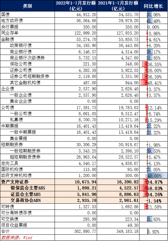 2022年1-7月份,我國資產(chǎn)證券化產(chǎn)品發(fā)行規(guī)模為10676億元,同步增長-34.87%。其中銀保監(jiān)會(huì)主管ABS發(fā)行規(guī)模為1898億元,同比增長-58.03%;證監(jiān)會(huì)主管ABS發(fā)行規(guī)模為5842億元,同比增長-34.26%;交易商協(xié)會(huì)ABN發(fā)行規(guī)模為2936億元,同比增長-1.54%。