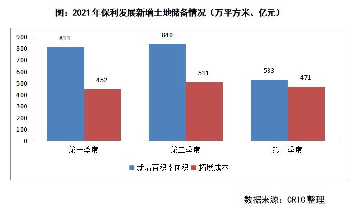除了借新還舊外,在當前環境下,保利發展積極融資也有逆勢超車的意圖。2021年前三季度,保利發展新拓展項目113個,新增容積率面積2184萬平方米,同比增長10%;總拓展成本1434億元,同比增長9%。其中第三季度在土拍市場較冷,民企受制于還款壓力收縮拿地的背景下,保利發展繼續保持較為積極的拿地態勢,新增容積率面積533萬平方米,總拓展成本471億元。