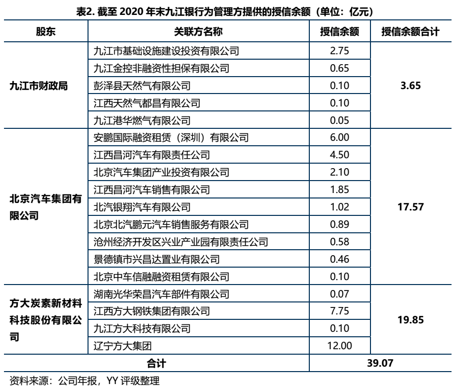截至2020年末,九江銀行為關(guān)聯(lián)方共提供了41.06億元的授信額度。其中對方大炭素及其關(guān)聯(lián)公司的綜合授信額度最高,達到了19.85億元,授信對象之一江西方大鋼鐵集團本身獲得外部授信充足,另一對象遼寧方大集團也有12億余額授信。