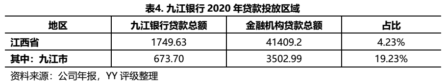 從江西省內(nèi)來看,共有五家城商行,九江銀行資產(chǎn)規(guī)模僅次于江西銀行,在江西省內(nèi)的金融地位較高,且九江市財政局是其最大股東,國有背景較強。從其貸款的投放情況也可以看出九江銀行在九江市內(nèi)承擔(dān)了比較重要的金融角色。2020年九江銀行為九江市提供貸款673.70億元的貸款,占全市發(fā)放貸款的19.23%,為江西省提供貸款總額為1749.63億元,占江西省金融機構(gòu)貸款余額的4.23%,區(qū)域?qū)I性較強,因此貸款資產(chǎn)需要以九江市為重點來分析。