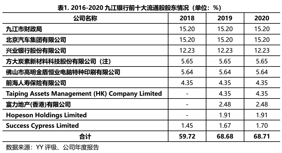 九江銀行最近3年前十大股東結(jié)構(gòu)沒有發(fā)生較大的變化,股權(quán)結(jié)構(gòu)比較穩(wěn)定。其中九江市財政局通過九江財企金融服務(wù)有限公司間接持有九江銀行4000萬股,通過一致行動人九江市國有資產(chǎn)經(jīng)營有限公司持有該行4345.48萬股,合計持有18.67%普通股股份,為九江銀行的最大股東。2020年末,前4大主要股東都沒有出質(zhì)九江銀行的股份。