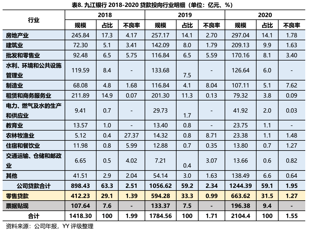 九江銀行通過貸款、公司債券投資以及非標資產(chǎn)投資流向房地產(chǎn)及相關(guān)行業(yè)的資金規(guī)模較大,且九江市房地產(chǎn)的市場不溫不火,可能會是潛在的風(fēng)險點;2020年疫情對貸款期限延長可能導(dǎo)致未來風(fēng)險集中暴露。