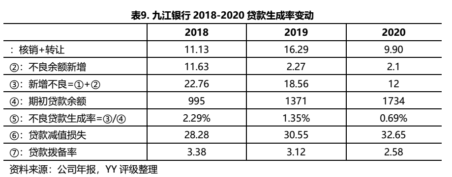 再從動態(tài)角度來分析九江銀行的貸款質(zhì)量。2018-2020年,九江銀行貸款生成率有下降趨勢,綜合動態(tài)和靜態(tài)的不良率來看,九江銀行的貸款質(zhì)量確實有轉(zhuǎn)好的趨勢。