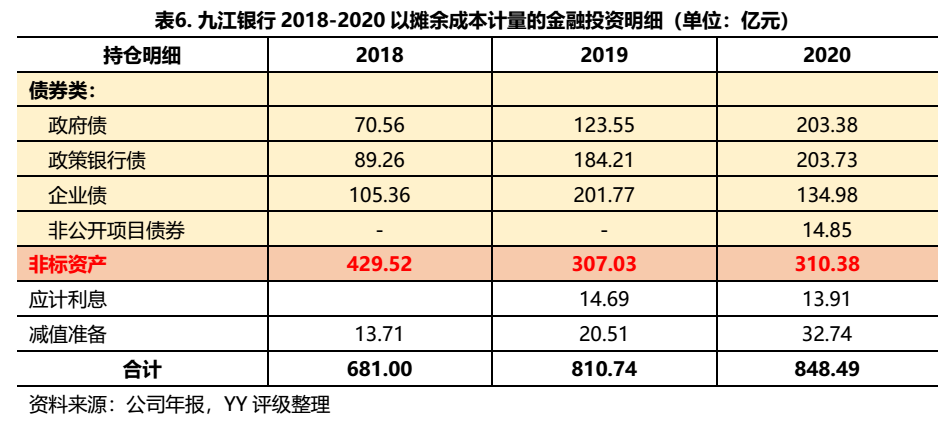 九江銀行近三年的非標資產(chǎn)規(guī)模已有較大幅度的壓降但絕對規(guī)模仍然較大,2020年金融投資計提了大額的減值損失,較大的可能是非標資產(chǎn)出現(xiàn)損失。
