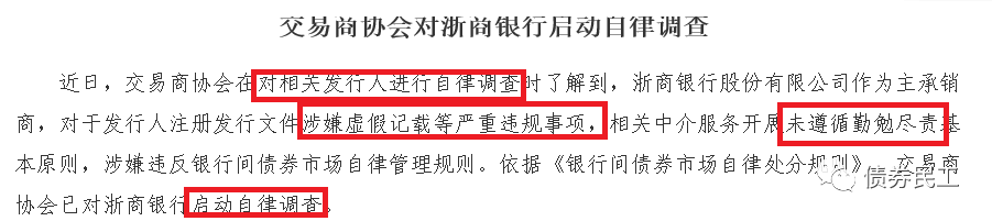 2021年4月6日,中國銀行間市場交易商協會公告,對浙商銀行啟動自律調查,主要原因是浙商銀行“對于發行人注冊發行文件涉嫌虛假記載等嚴重違規事項”。值得關注的是,這次自律調查的起因是在“對相關發行人進行自律調查時”發現的,也就是線索可能直接來源于發行人。