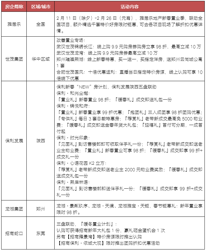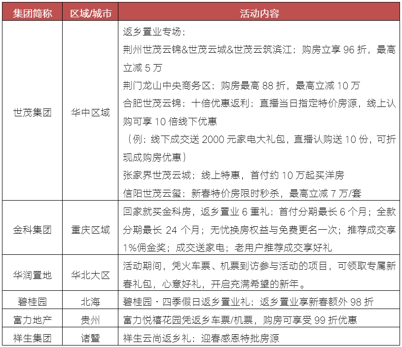 中央號召“就地過年”,影響返鄉置業需求的釋放,不少房企在推廣時弱化了“返鄉置業”這一口號。根據CRIC監測,2021年春節期間,房企“返鄉置業”活動多數都是以項目層面推出,TOP30房企中僅有世茂、金科等少數房企推出了區域聯動的返鄉活動。而促銷方式多以小額現金紅包、車票報銷等優惠為主,部分項目可以憑車票享99折、98折等折扣。比較亮眼的當屬世茂華中區域的返鄉置業專場直播,活動規模和力度都比較大,如荊門龍門中央商務區項目最高可達88折。