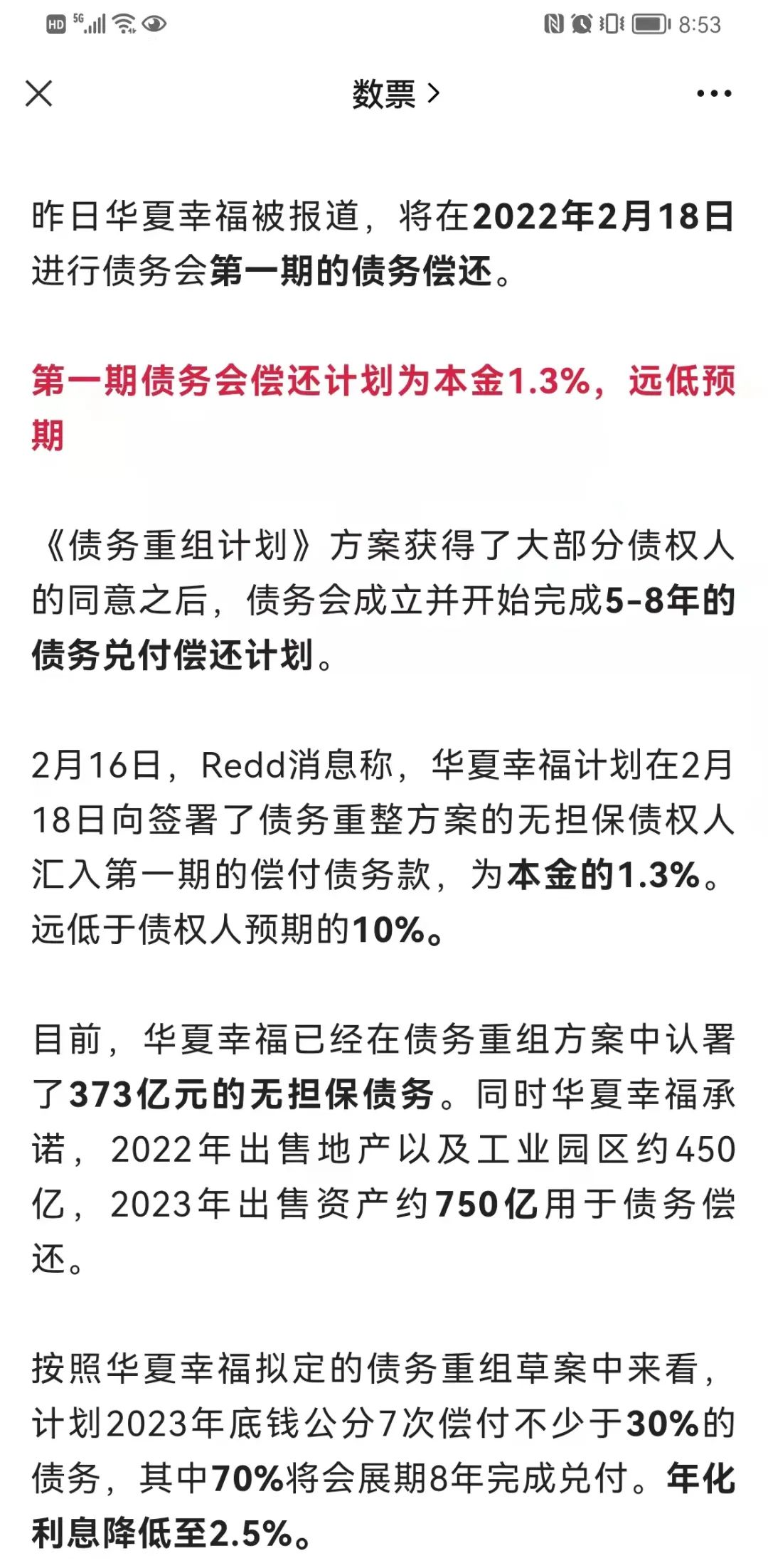 一張來自有關自媒體(數票)總結歸納的還款計劃圖,將事情本來的面貌公之于眾??赐晷畔⒅笪逦峨s陳,對于華夏幸福而言,此次債務償還十分不理想;對于金融機構而言,這樣的還款計劃只能說聊勝于無。