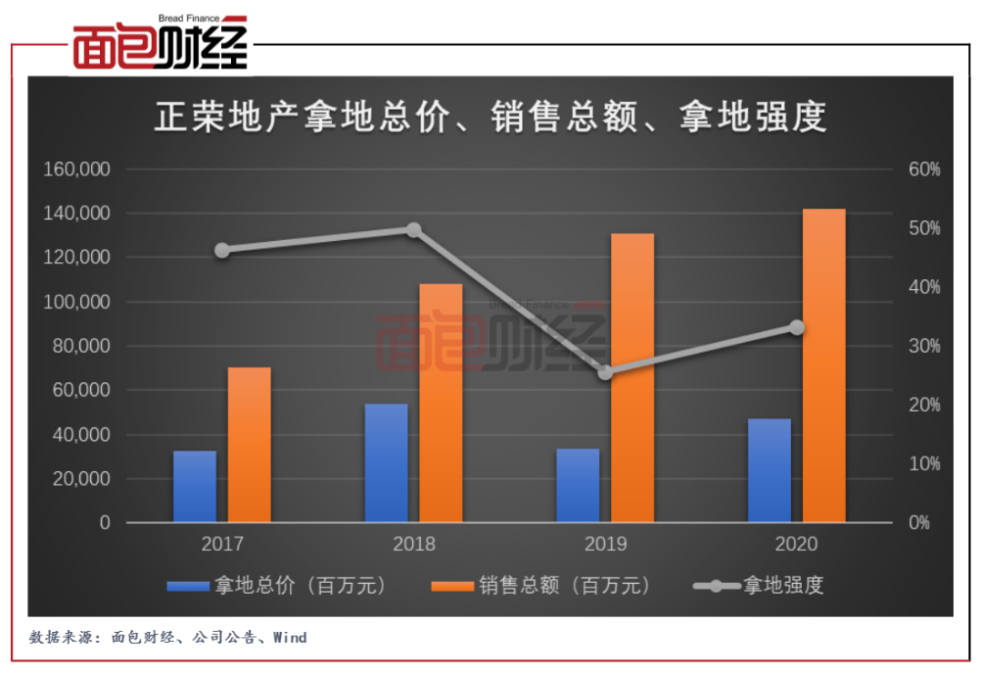 報告期內,正榮地產新增土地儲備2.5百萬平方米,同比增長約25%;拿地總價472.21億元,同比增長41.38%。拿地強度方面,在金額口徑下,公司2020年拿地強度為33.28%,同比上升7.73個百分點。