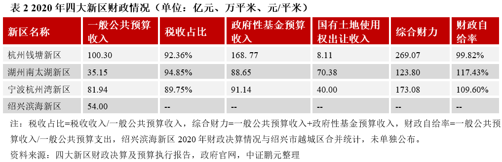 從可獲得數(shù)據(jù)來看,2020年杭州錢塘新區(qū)、寧波杭州灣新區(qū)一般公共預算收入規(guī)模較高,而紹興濱海新區(qū)(54.0億元)與湖州南太湖新區(qū)(31.5億元)整體收入規(guī)模偏小;質(zhì)量方面,杭州錢塘新區(qū)與杭州錢塘新區(qū)、湖州南太湖新區(qū)稅收占比均在90%左右,一般公共預算收入質(zhì)量較高。2020 年錢塘新區(qū)政府性基金預算收入規(guī)模較高,湖州南太湖新區(qū)國有土地使用權(quán)出讓收入占比為79.39%,土地財政依賴度較高。財政收支方面,杭州錢塘新區(qū)、寧波前灣新區(qū)與湖州南太湖新區(qū)2020年財政自給率分別為99.82%、109.60%和117.43%,收支平衡性較強。