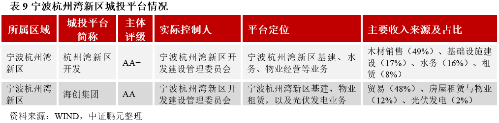 寧波杭州灣新區(qū)主要擁有兩個發(fā)債城投平臺,分別為寧波杭州灣新區(qū)開發(fā)建設(shè)有限公司(以下簡稱“杭州灣新區(qū)開發(fā)”)、寧波海創(chuàng)集團有限公司(以下簡稱“海創(chuàng)集團”),其中杭州灣新區(qū)開發(fā)為主體評級AA+平臺,海創(chuàng)集團為主體評級AA平臺。