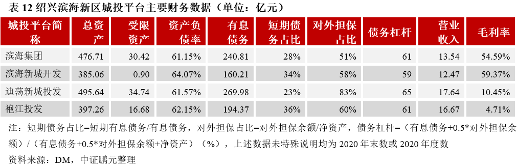 紹興濱海新區(qū)主要擁有四個發(fā)債城投平臺,分別為紹興濱海新區(qū)發(fā)展集團有限公司(以下簡稱“濱海集團”)、浙江濱海新區(qū)開發(fā)投資有限公司(以下簡稱“濱海新城開發(fā)”)、紹興高新技術(shù)產(chǎn)業(yè)開發(fā)區(qū)迪蕩新城投資發(fā)展有限公司(以下簡稱“迪蕩新城投發(fā)”)和紹興袍江工業(yè)區(qū)投資開發(fā)有限公司(以下簡稱“袍江投發(fā)”),其中濱海集團、迪蕩新城投發(fā)和袍江投發(fā)均為主體評級AA+平臺,濱海新城開發(fā)為主體評級AA平臺。