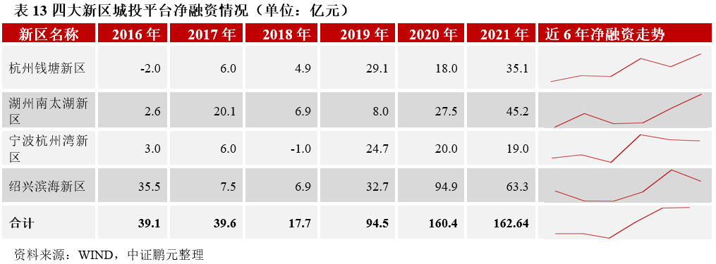 2019年后四大新區(qū)整體凈融資規(guī)模實現(xiàn)大幅增長,并在2021年保持相對高位,其中紹興濱海新區(qū)凈融資規(guī)模最高,杭州錢塘新區(qū)與寧波杭州灣新區(qū)規(guī)模增長較快