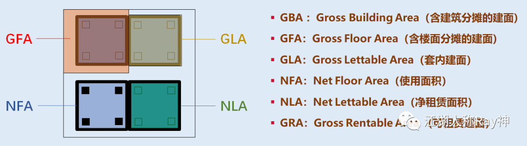 在之前的文章中,我們提到過不動產(chǎn)的面積類型包括:建筑面積(GFA或GBA)、套內(nèi)面積(GLA)、使用面積(NFA)等等。這幾種面積類型其實都是從空間的物理維度進行衡量的,即:空間在圖紙上或?qū)嶓w建筑上客觀存在著的面積。這幾種面積通常會體現(xiàn)在我們的產(chǎn)權(quán)證上,因此通常也可以認為是產(chǎn)權(quán)口徑的數(shù)據(jù)。一般我們進行面積測量,首先要搞清楚的就是這幾個口徑的面積。特別是,當項目沒有將產(chǎn)權(quán)切分到房間的時候,那業(yè)主方就更需要自己去理清楚它們之間的關(guān)系。