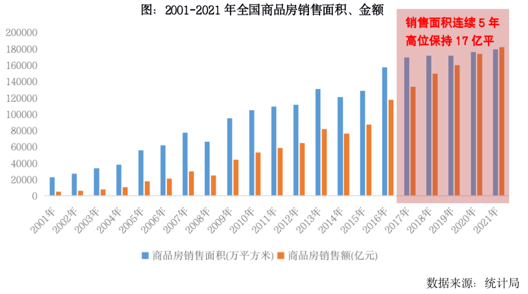 第五,住房需求趨于飽和,商品房銷售面積連續(xù)5年高位保持17億平方米。2017-2021年,全國商品房銷售面積連續(xù)5年高位保持在17億平方米。2021年,全國商品房銷售面積17.9億平方米,同比僅增長1.9%。與此同時,全國城鎮(zhèn)居民人均居住面積達到40平方米以上,真實反映行業(yè)規(guī)模基本見頂,未來成交規(guī)模或將步入下降通道。
