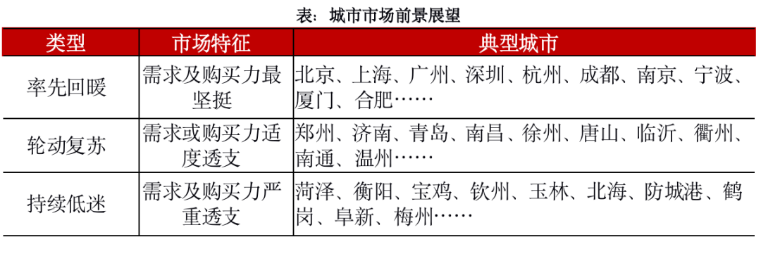 因此,我們認為隨著市場信心逐步恢復,北京、上海、杭州等核心一二線城市市場有望率先轉暖,鄭州、濟南、徐州等弱二線及強三線城市市場或將輪動復蘇。基于市場需求及購買力嚴重透支,菏澤、北海、寶雞等弱三四線城市市場或將持續(xù)低迷。
