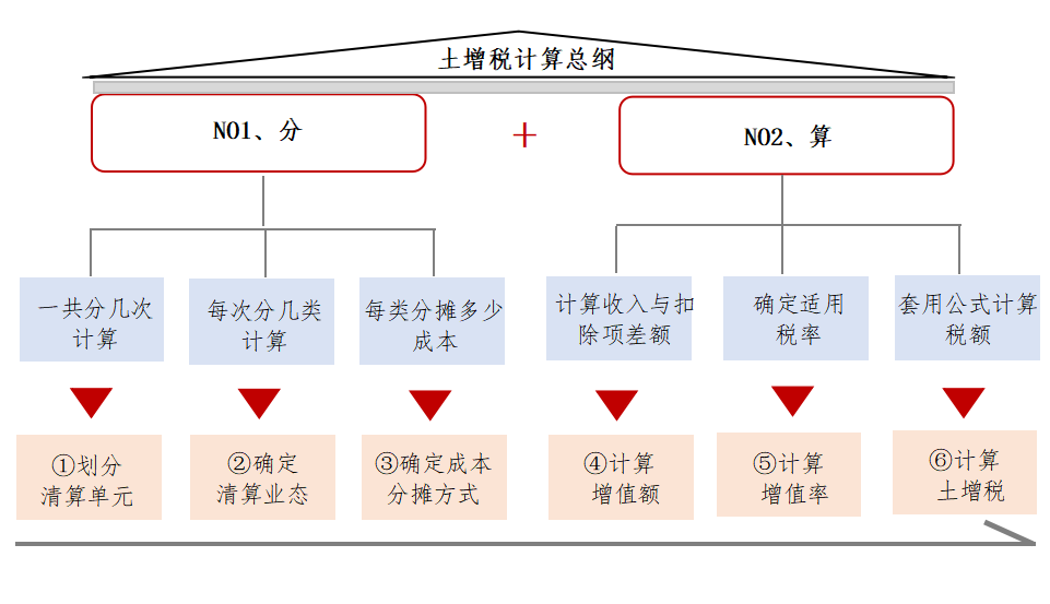 大家都知道,土增稅計算過程,可以分解為——“分”和“算”兩個步驟,即:分單元、分業態、分攤成本。然后再對應計算收入、成本、增值率…如下圖示: